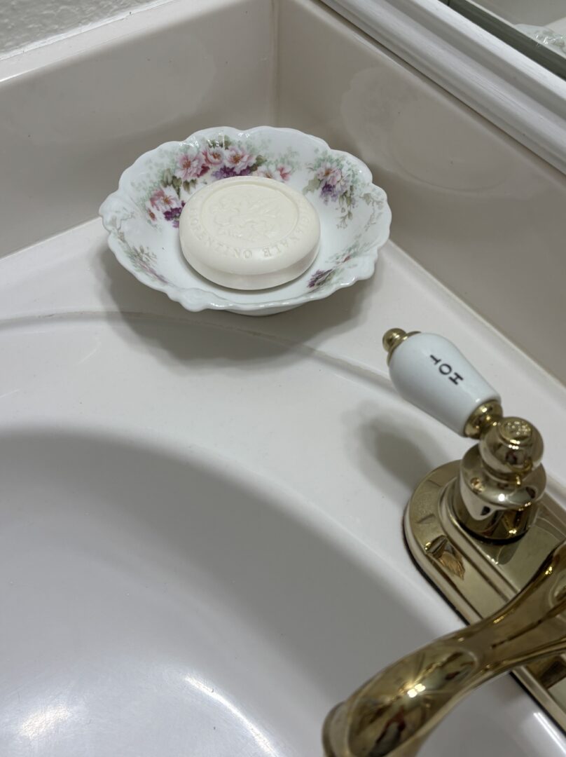 When I first made over the space I placed a lovely bar of soap in a sweet Bavarian china dish. But that has since changed. Sometimes function over form is necessary.
