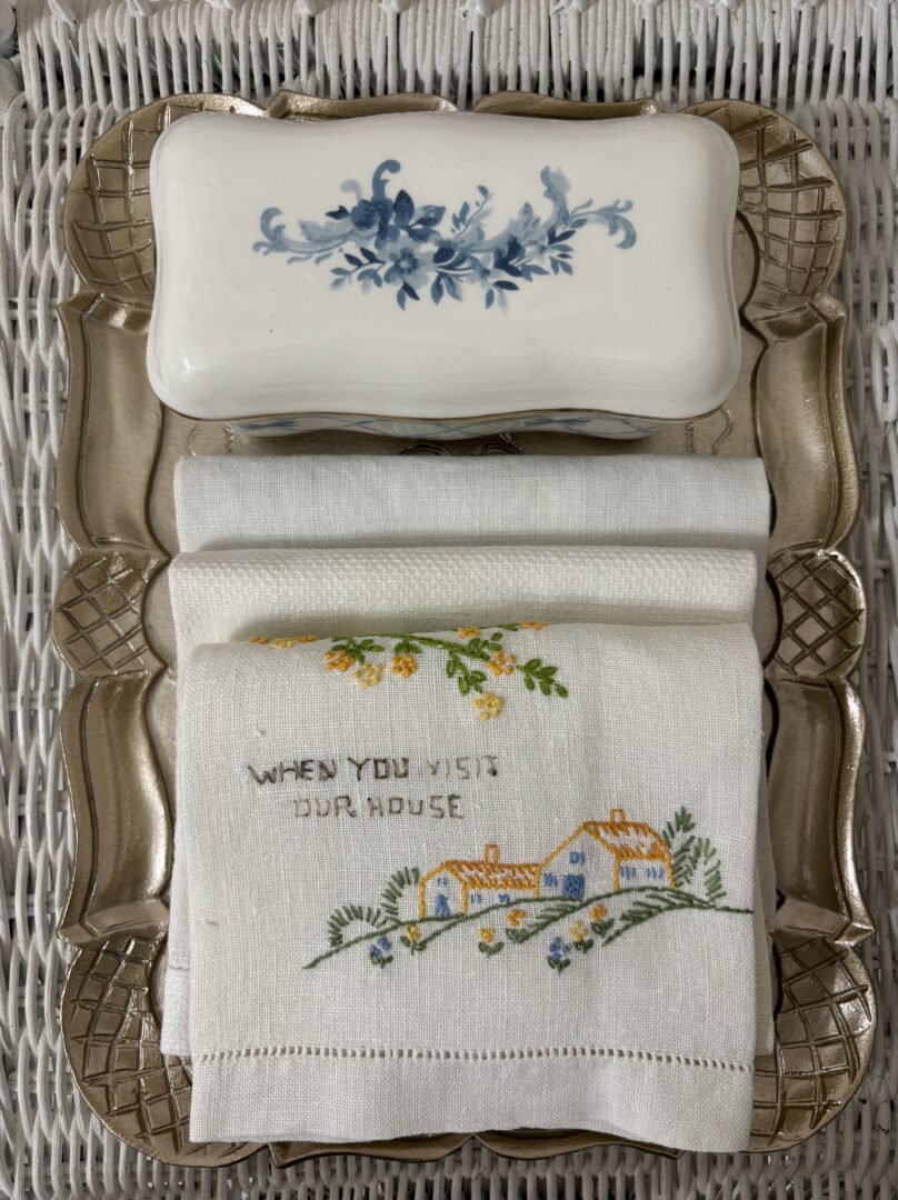 The cabinet contains things such as q tips in a single antique Bavarian creamer that I bought years ago for maybe 25 cents. Hand creams, lavender oil, and other treats also await our guests.