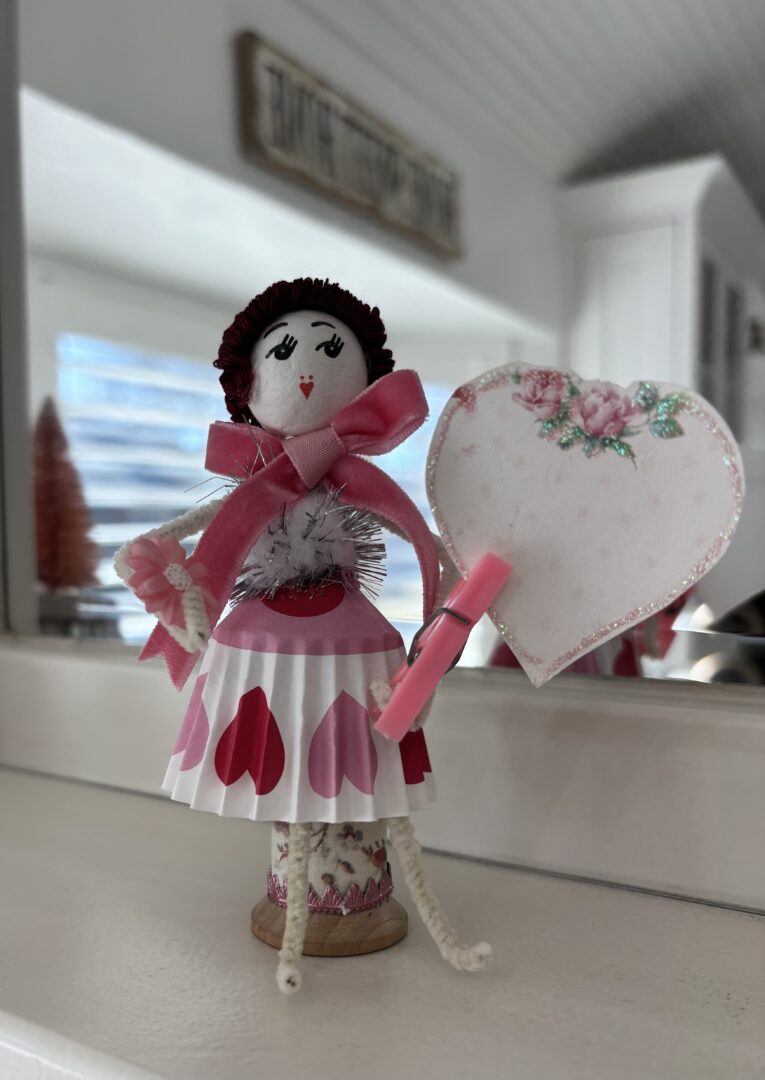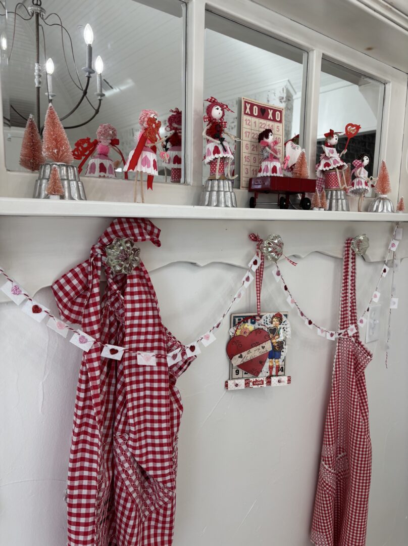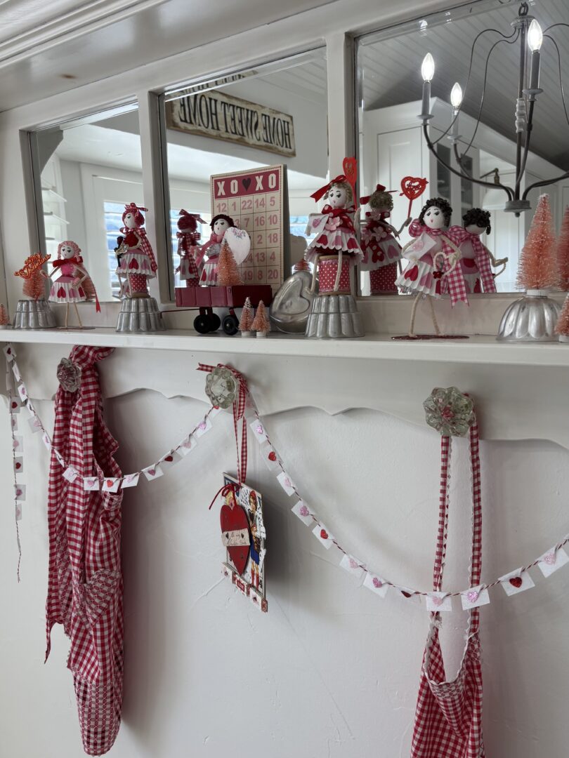 I’m not sure if they are the cutest thing ever because they are on vintage molds or their clothes are made from cupcake liners! So stinkin’ cute! I can’t imagine the time and effort that went into making them, but it seems worth it because your Valentine’s shelf is adorable. So fun. pinned